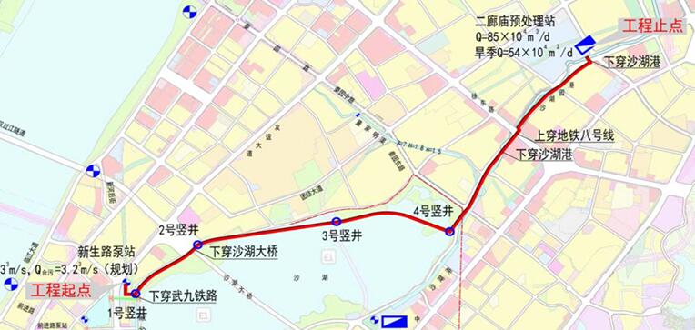 武漢長江、沙湖水環境提升工程是國家“長江大保護”戰略部署以及武漢水環境治理重要一環,也是湖北省內首次實施的最大直徑頂管工程。工程主線起于新生路污水泵站,穿越武九鐵路后,沿沙湖北岸線、沙湖公園、沙湖大道走向,進入二郎廟污水預處理站,中間由5780米長的大口徑地下管道相連。