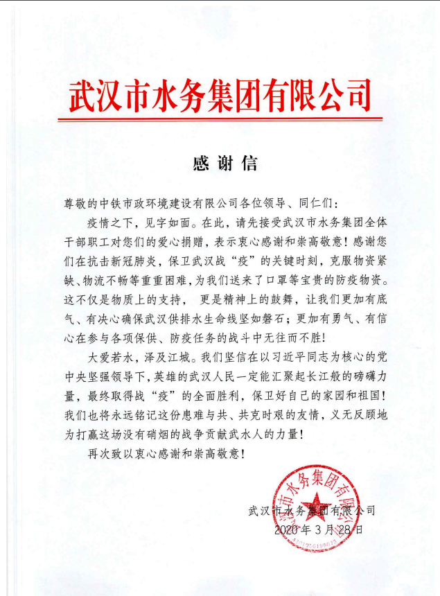 3月28日,公司承建的武漢黃家湖污水處理廠三期擴建工程在抗擊新冠肺炎,保衛武漢戰“疫”的關鍵時刻,克服物資緊缺、物流不暢等困難,向武漢市水務集團有限公司贈送口罩等防疫物資,與他們患難與共、共克時艱,做好疫情防控工作。為此,武漢市水務集團有限公司特致電表示感謝。